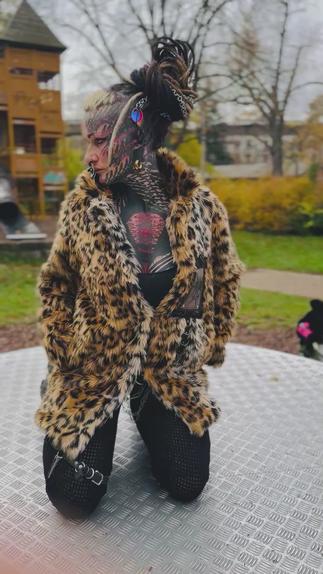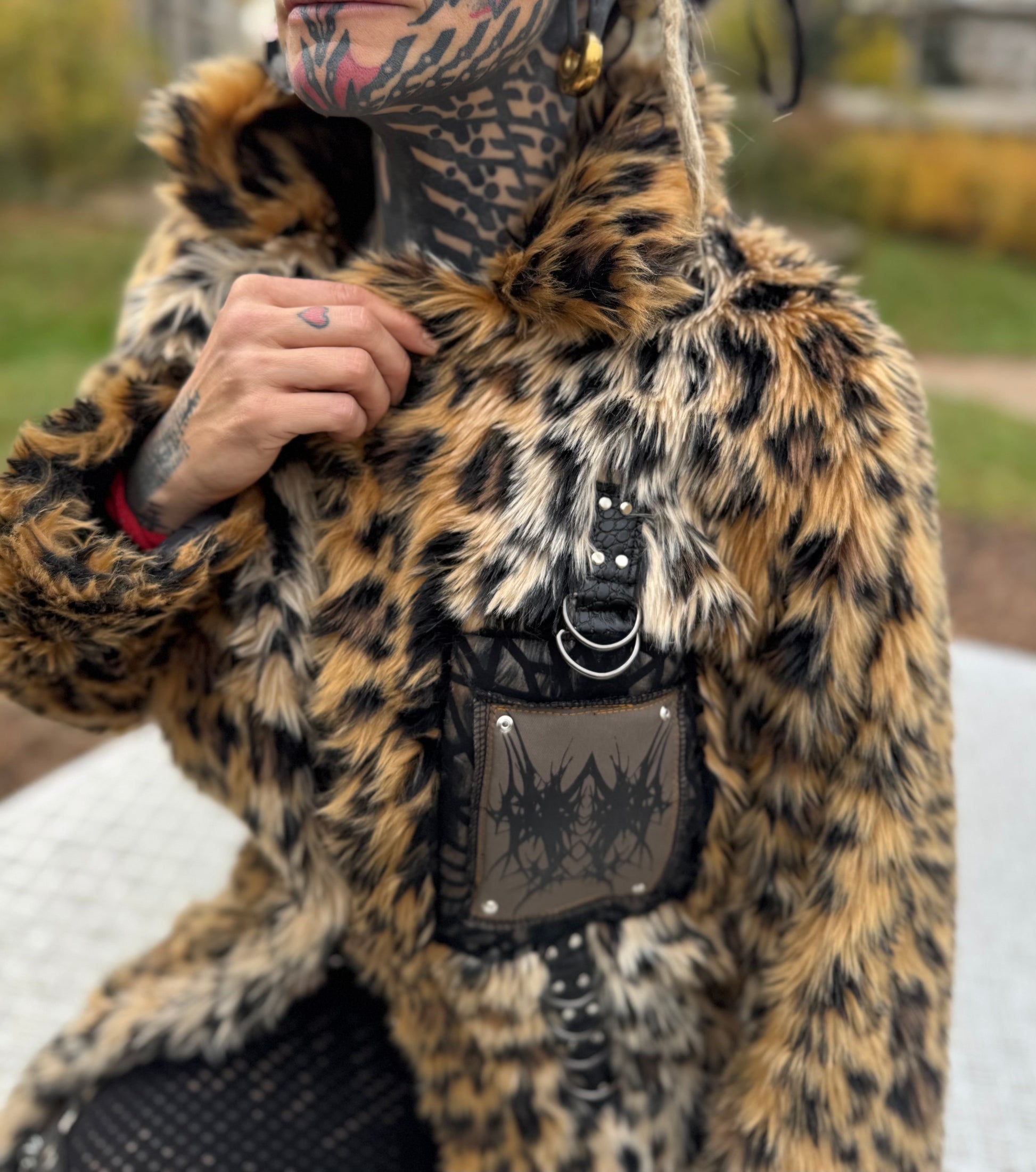 - Upcycle Kunstfell Mantel/ Jacke mit großen Rückenpatch mit Ösen , Kunstleder, Edelstahl Ringen & Schiebern