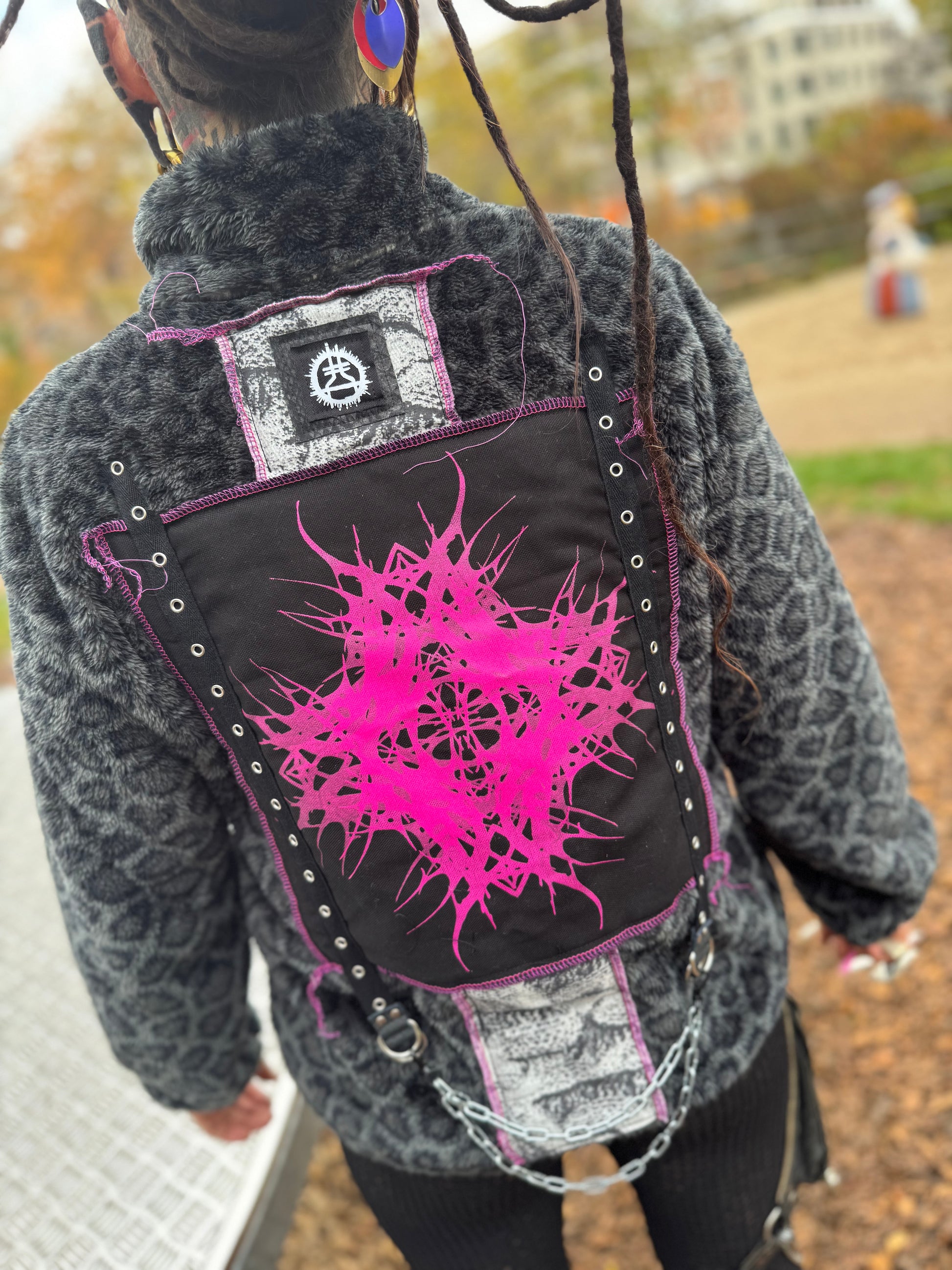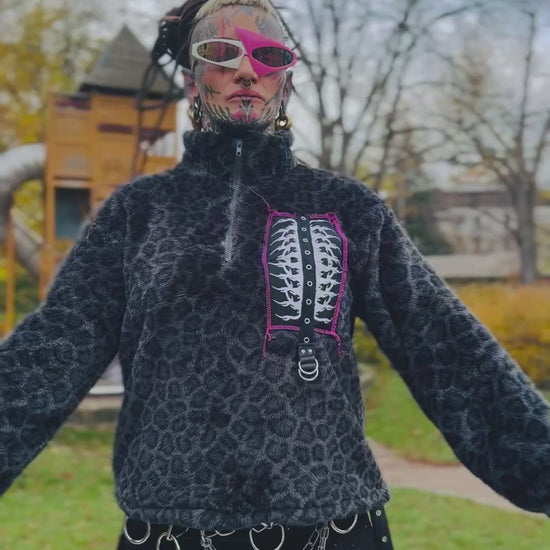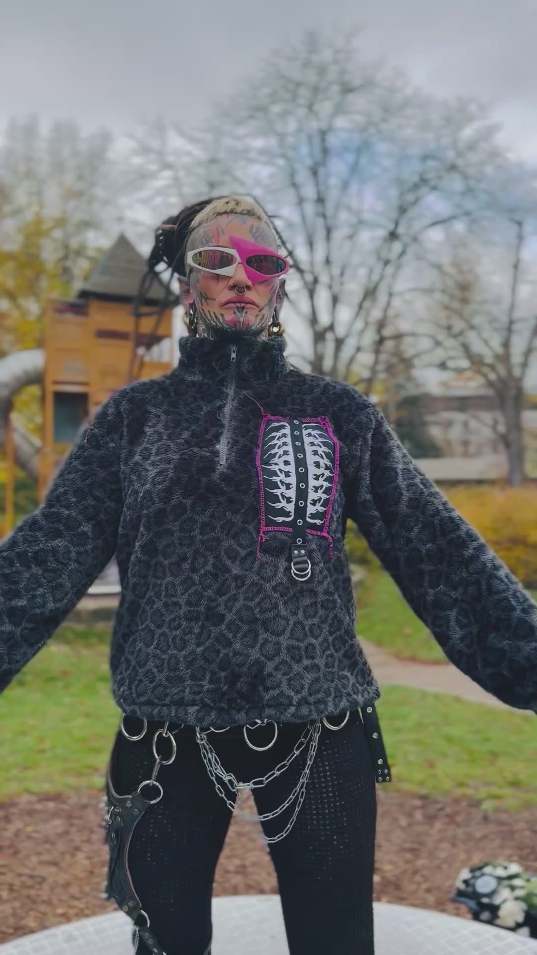 - Upcycle graue Kunstfell Leopard Jacke mit Reißverschluss am Kragen